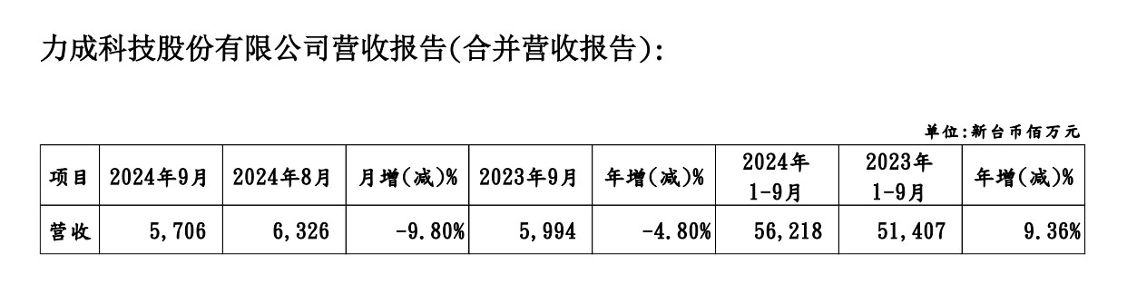 力成科技股份有限公司,2024 年 09 月份自行结算合并营收 57.06 亿元,较 2024 年 08 月份合并营收 63.26 亿元减少 9.80%,较去年同期 2023 年 09 月份合并营收 59.94 亿元减少 4.80%。
