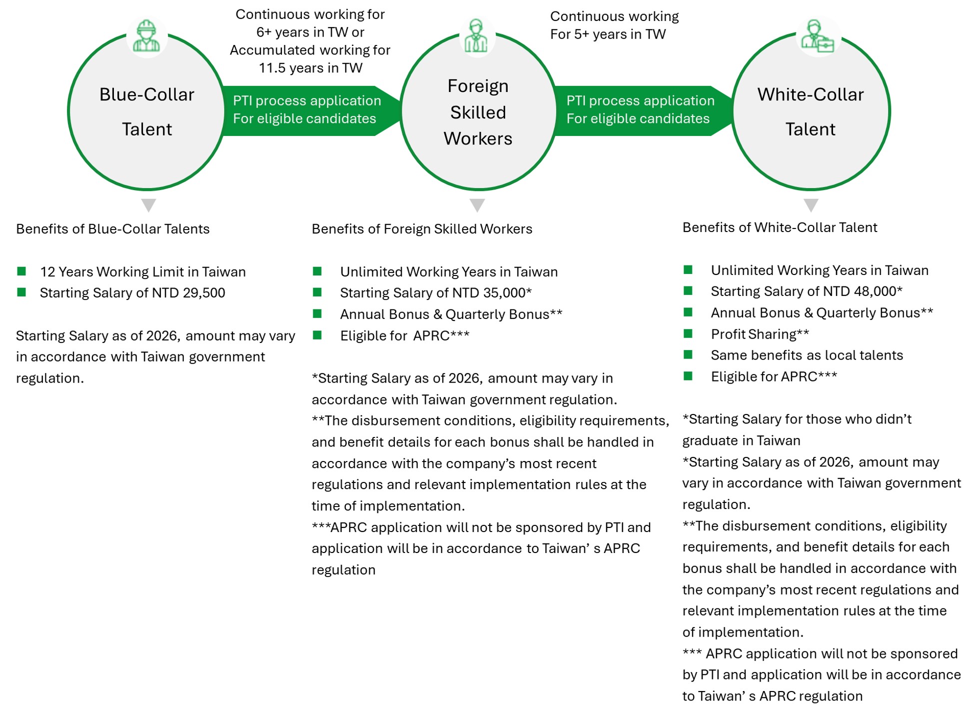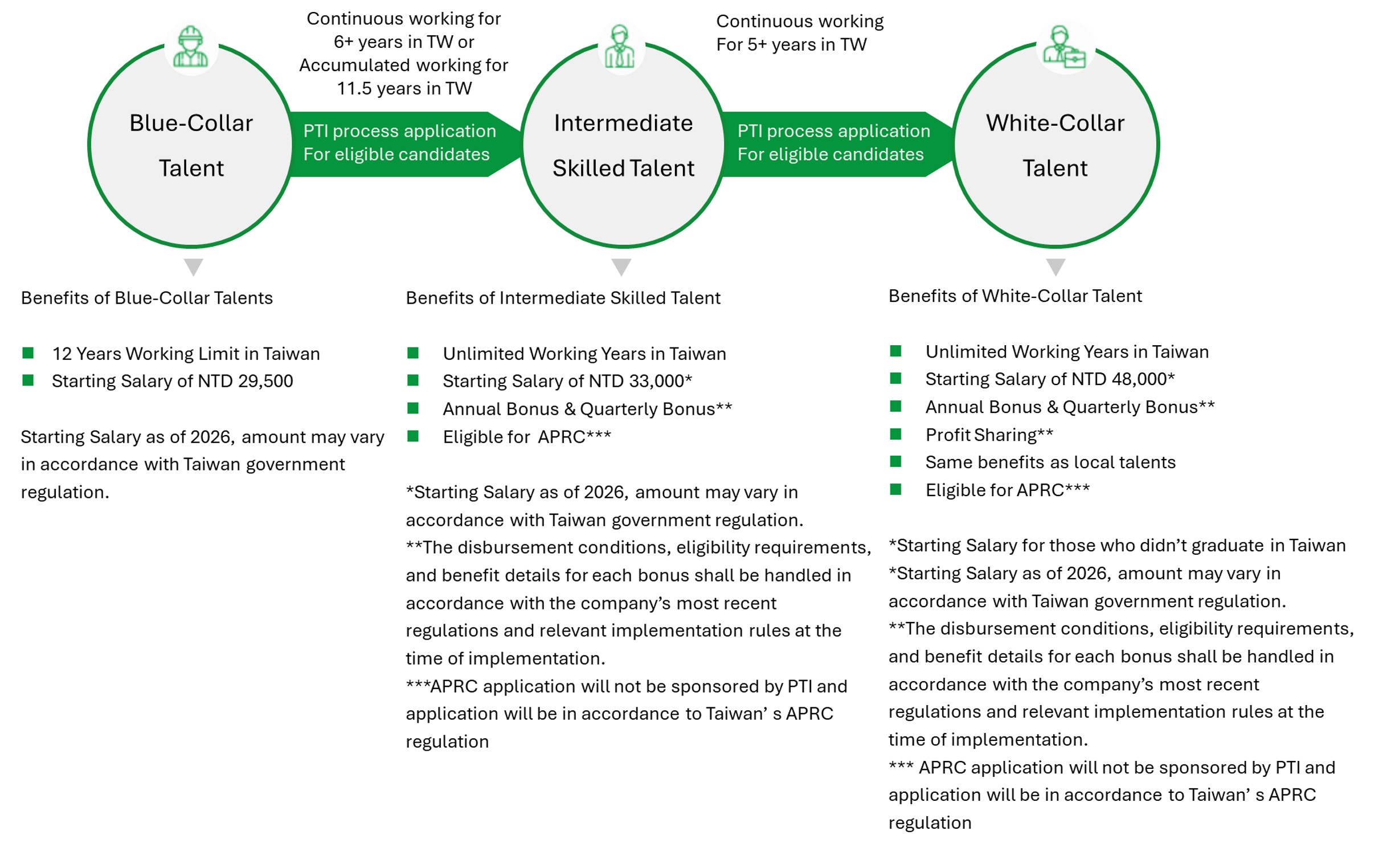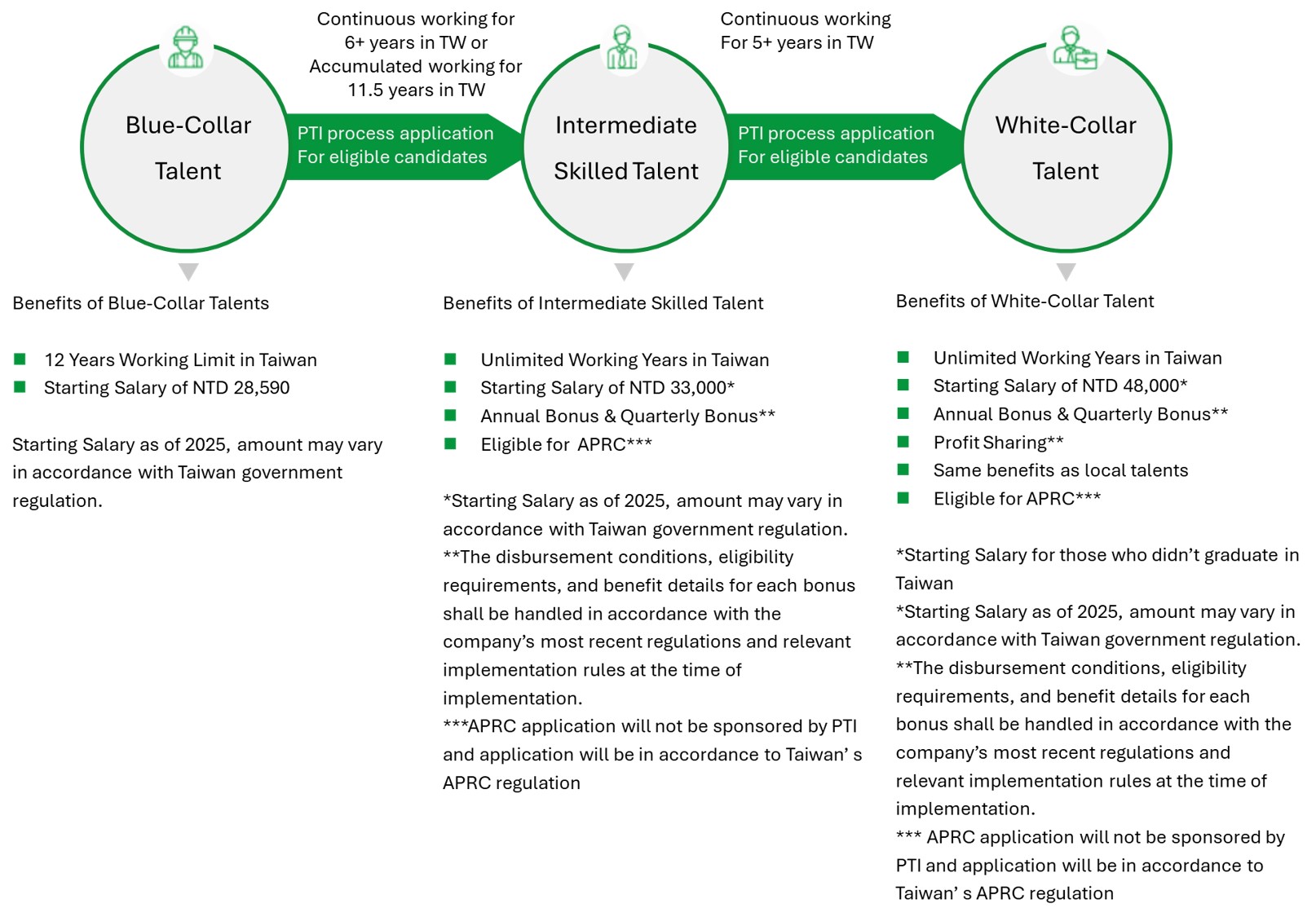 | Minimum Work Experience | - | Consecutively working in Taiwan 6 years or more | Worked as Intermediate Skilled Talent 1 for at least 1 year | Worked as Intermediate Skilled Talent for a total of 5 years or more |