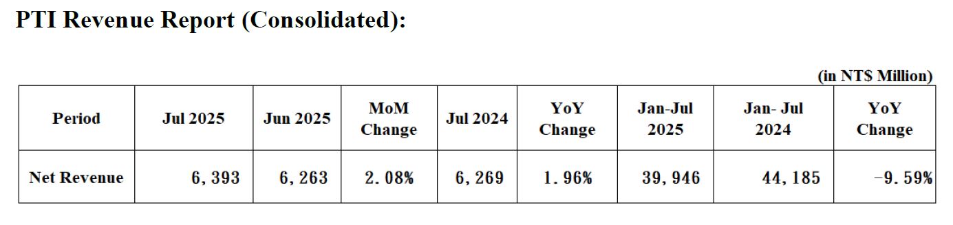 Hsinchu, Taiwan- Aug 7, 2025 – PTI (TWSE: 6239) today announced its net revenue for Jul. 2025 on a consolidated basis, revenue for Jul. 2025 was approximately NT$ 6,393 million, an increase of 2.08 percent from Jun. 2025.