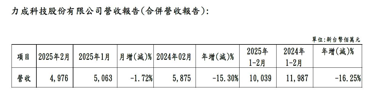 力成科技2025年02月營收報告